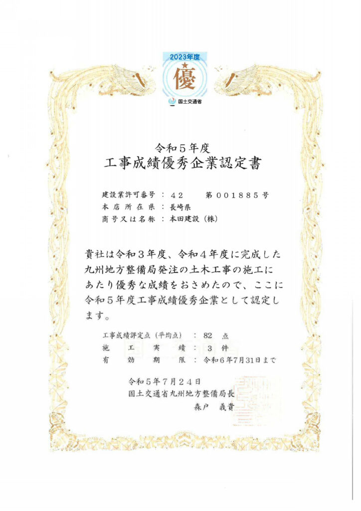 令和5年度工事成績優秀企業認定